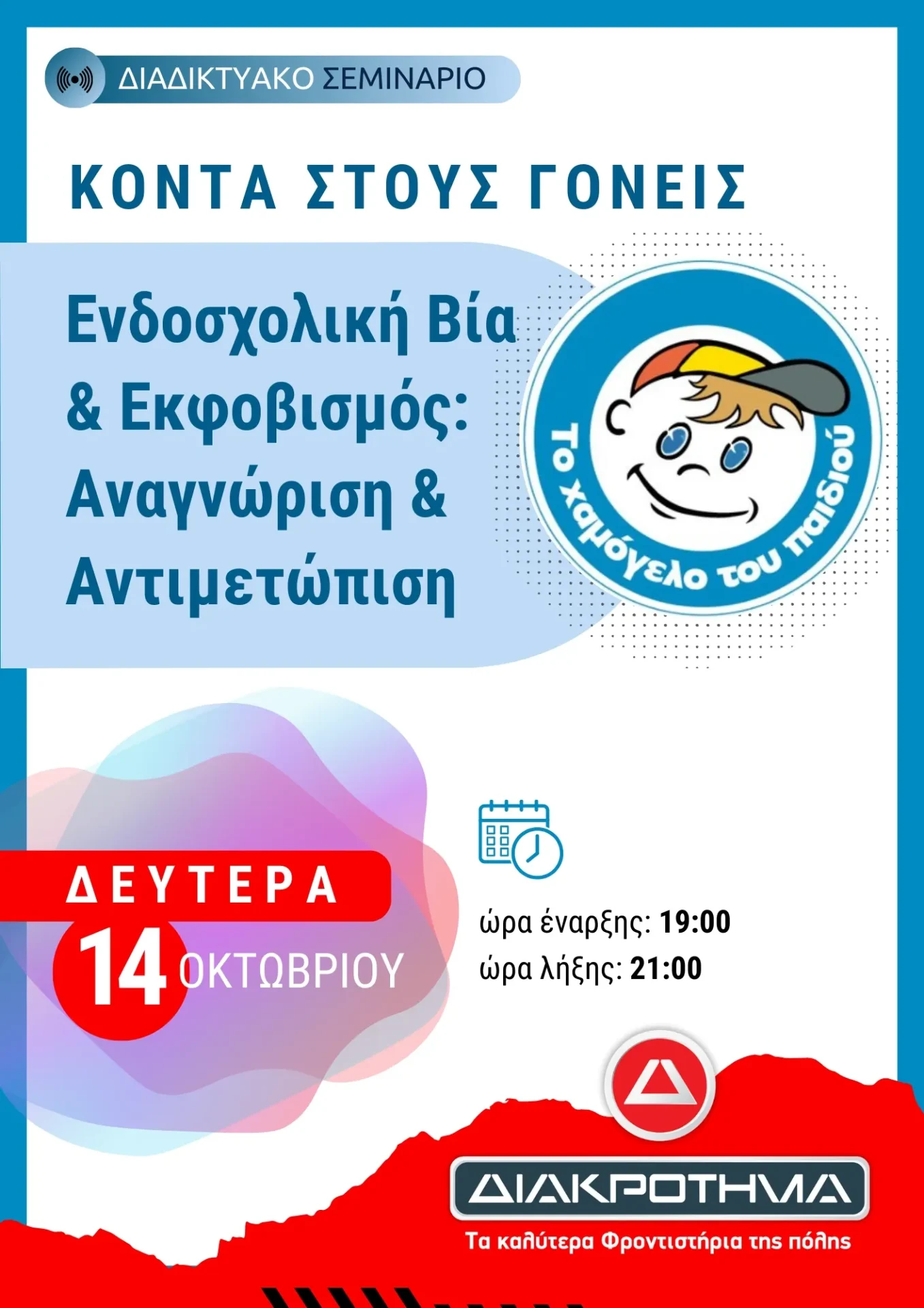 Το Χαμόγελο του Παιδιού» μαζί με το ΔΙΑΚΡΟΤΗΜΑ σε μία διαδραστική παρέμβαση με τους γονείς των μαθητών μας με θέμα: «Ενδοσχολική Βία & Εκφοβισμός: Αναγνώριση & Αντιμετώπιση»