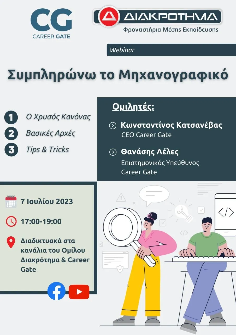 Μπορείτε να παρακολουθήσετε #live το Webinar στα κανάλια της #CareerGate και του Ομίλου ΔΙΑΚΡΟΤΗΜΑ στο facebook https://www.facebook.com/careergatetest , https://www.facebook.com/Diakrotima.Frontistiria/about