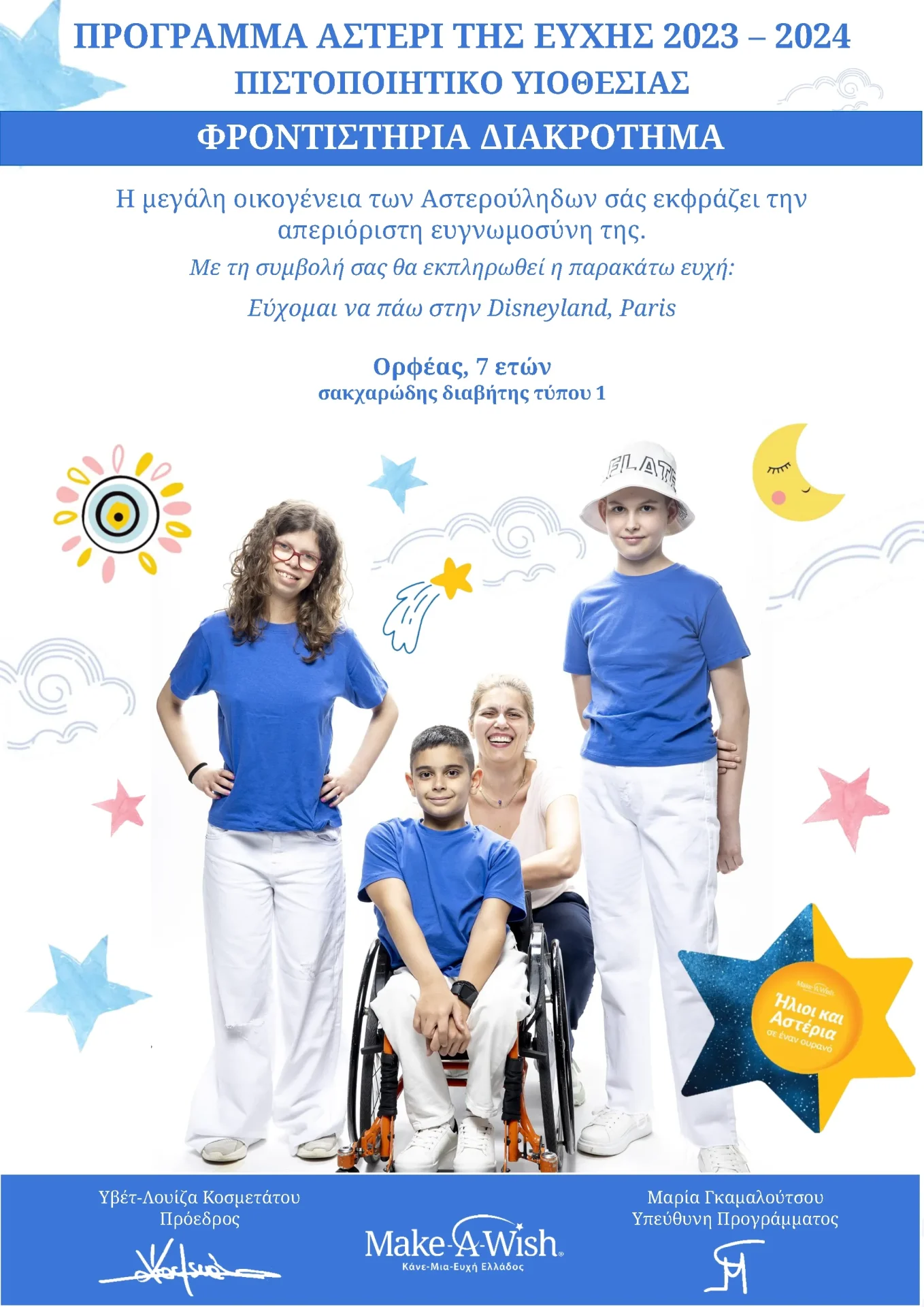 ΠΡΟΓΡΑΜΜΑ ΑΣΤΕΡΙ ΤΗΣ ΕΥΧΗΣ 2023 – 2024 ΠΙΣΤΟΠΟΙΗΤΙΚΟ ΥΙΟΘΕΣΙΑΣ ΦΡΟΝΤΙΣΤΗΡΙΑ ΔΙΑΚΡΟΤΗΜΑ Η μεγάλη οικογένεια των Αστερούληδων σάς εκφράζει την απεριόριστη ευγνωμοσύνη της. Με τη συμβολή σας θα εκπληρωθεί η παρακάτω ευχή: Εύχομαι να πάω στην Disneyland, Paris Ορφέας, 7 ετών σακχαρώδης διαβήτης τύπου 1
