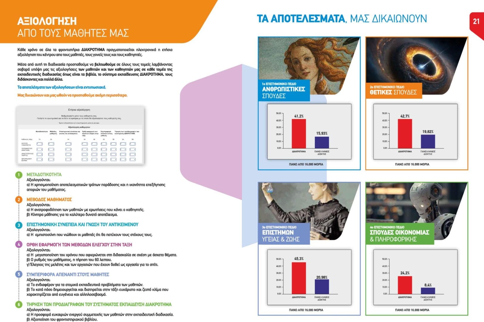 Κάθε χρόνο σε όλα τα φροντιστήρια ΔΙΑΚΡΟΤΗΜΑ πραγµατοποιείται ηλεκτρονικά η ετήσια αξιολόγηση του κέντρου απο τους µαθητές, τους γονείς τους και τους καθηγητές. Μέσα από αυτή τη διαδικασία προσπαθούµε να βελτιωθούµε σε όλους τους τοµείς λαµβάνοντας σοβαρά υπόψη µας τις αξιολογήσεις των µαθητών και των καθηγητών µας σε κάθε τοµέα της εκπαιδευτικής διαδικασίας όπως είναι τα βιβλία, το σύστηµα εκπαίδευσης ΔΙΑΚΡΟΤΗΜΑ, τους διδάσκοντες και πολλά άλλα. Τα αποτελέσµατα των αξιολογήσεων είναι εντυπωσιακά. Μας δικαιώνουν και µας ωθούν να προσπαθούµε ακόµη περισσότερο.